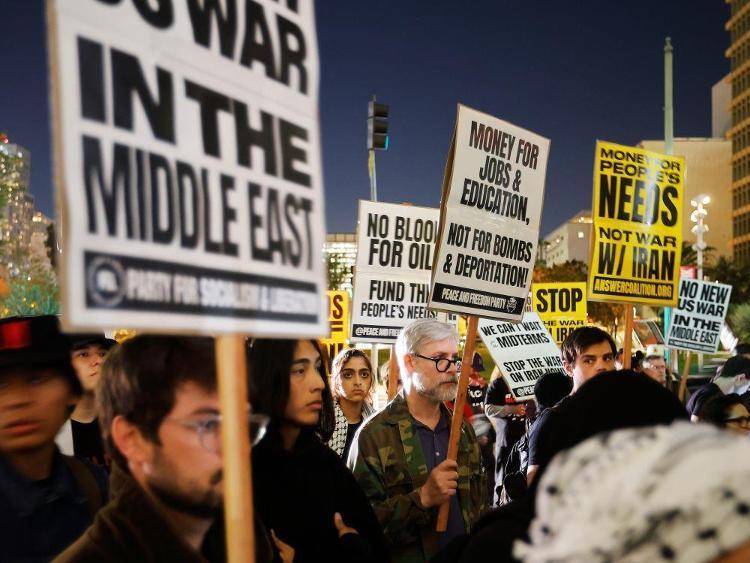 3月2日,东谈主们在好意思国加利福尼亚州洛杉矶插足聚拢,抗议好意思国对伊朗发动军事打击。新华社发